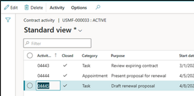 Managing contracts manually is arduous and creates risk to your business. Contract management in Microsoft Dynamics 365 helps mitigate risks and improve compliance by aggregating and organizing contract data in one place. Manage to-do lists, tasks and activities using the activity management function which allows organization to create relevant activities from the contract and assign responsible employee for the task, monitor the progress of the task, create calendar invites and reminders. Employees can update the task by providing the details of the progress in percentage for tracking and can also provide comments and attach documents for reference